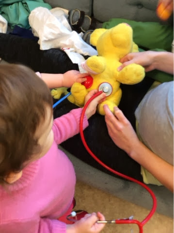 I dag var det tid for doktorleik igjen. Løveungen hadde skada seg i foten og Frøken Kanin hadde vondt i magen. Dei fikk bandasje og sprøyter over alt :-) men det vart friske til slutt heldigvis!